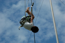 はしごをえっちらおっちらと登り、スタート地点で待っているGOのところへ。ベルトと安全用のロープをつなぎ、いざ
