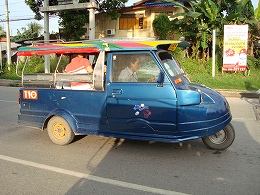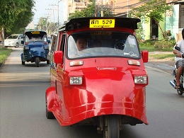 アユタヤのトゥクトゥクは三輪なのです。座席部分の天井も低く、大人はちょっと前かがみにならないとぶつかりそうです。