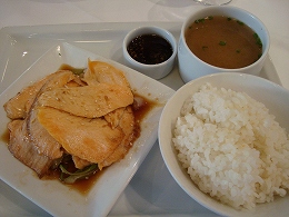 右:grilled salmon with japanese soya sauce and sesami seeds サーモンのしょうゆ焼き定食(?)ご飯が日本米でした。普通です。