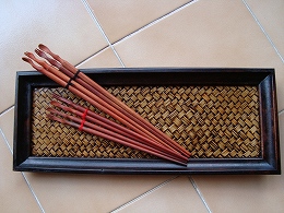 今回買ったのは、写真上右:木のトレイとお箸