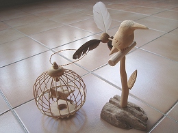 写真左:木の飾りモノ 鳥かごと風でくるくる回るシッポつきの鳥
