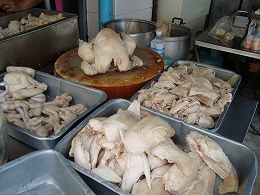 右:山とつまれた茹で鶏さんたちです。いったい一日に何羽、消費されるのかしら