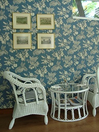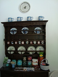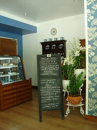 予想どおり水色の壁、白い家具のステキなカフェでした。店の奥にはクラシカルな棚にお皿やかわいいパッケージの紅茶が飾られていたり・・・イギリスっぽい雰囲気です