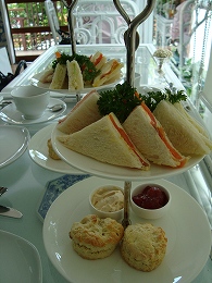 2段トレーには3種類のサンドイッチとスコーン。