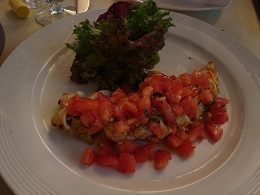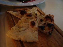 左:お通しのパン(?) 味付けはチーズとガーリックとシンプルながら、とてもおいしい~ 子供たちは一番おいしかったって言ってたし。