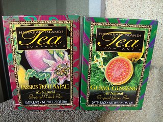 PASSION FRUIT NA PALI(パッションフルーツフレーバーの紅茶。NA PALIとはカウアイ島にある海岸の名前)とGUAVA GINSENG(グァバフレーバー+朝鮮人参入りの緑茶)です。ティーバッグになっていて、、20袋入ってます。箱のデザインもステキ