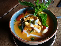 左:チキンレッドカレー カレーは、レッド・イエロー・グリーンの3種類から選び、さらに具をエビ・チキン・ポーク・ビーフの中から選びます。