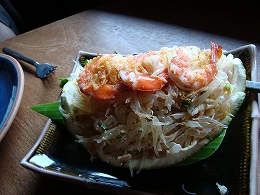 右:ソムオーサラダ 細かくほぐしたソムオーとチキン(ゆでた?蒸した?)を裂いたものを合えたサラダ