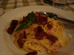 左:ピザ。その名も「BASILICO」 ちょっと薄めの生地がおいしい 右:ちゅんたの大好きな「カルボナーラ」
