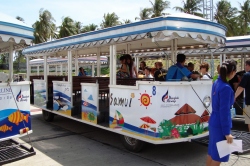 タラップを降りて、一度外に出ます。かわいいトラムに乗って、ターミナルに移動・・・