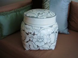 白をベースにカラフルに絵付けされた陶器。着物柄のようなものもあって、日本の家・和室にもピッタリだと思います。
