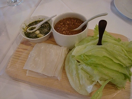 左:complicated noodle 美容師さんおススメの一品。レタスに餃子の皮のようなものをのせ、甘く味付けたひき肉をのせて、ピリ辛のたれをつけ、くるっと巻いて一緒に食べるのです。コレ、ほんとおいしかった