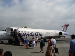 1時間待ち、ハワイアンエアに乗り(写真左)「ホノルル→コナ」約1時間のフライトでやっとやっと到着です